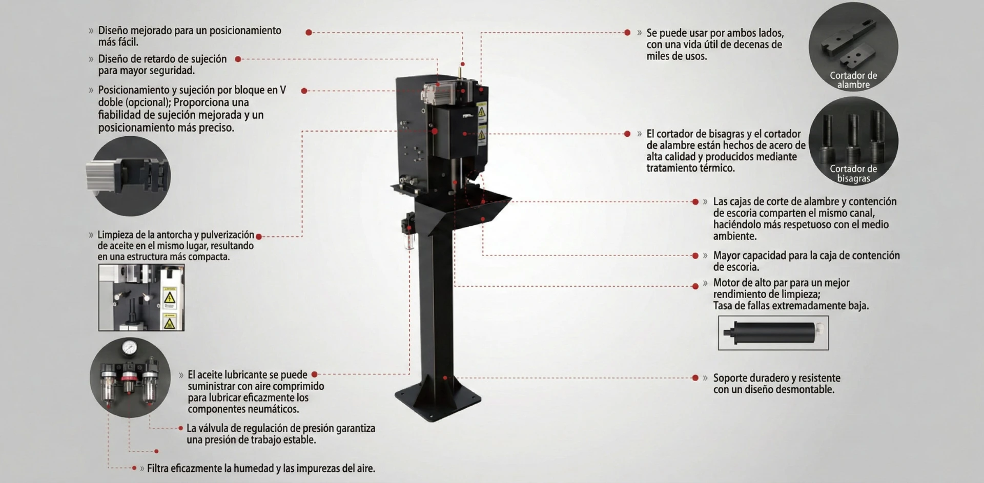 | Entrada de aire | Aire comprimido sin aceite, 5.5–8 bar |